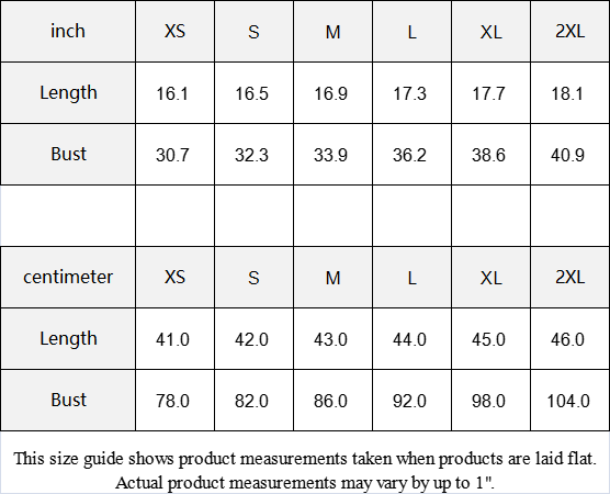 This size guide shows product measurements taken when products are laid flat. Actual product measurements may vary by up to 1".
