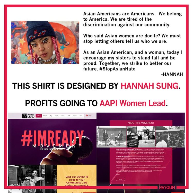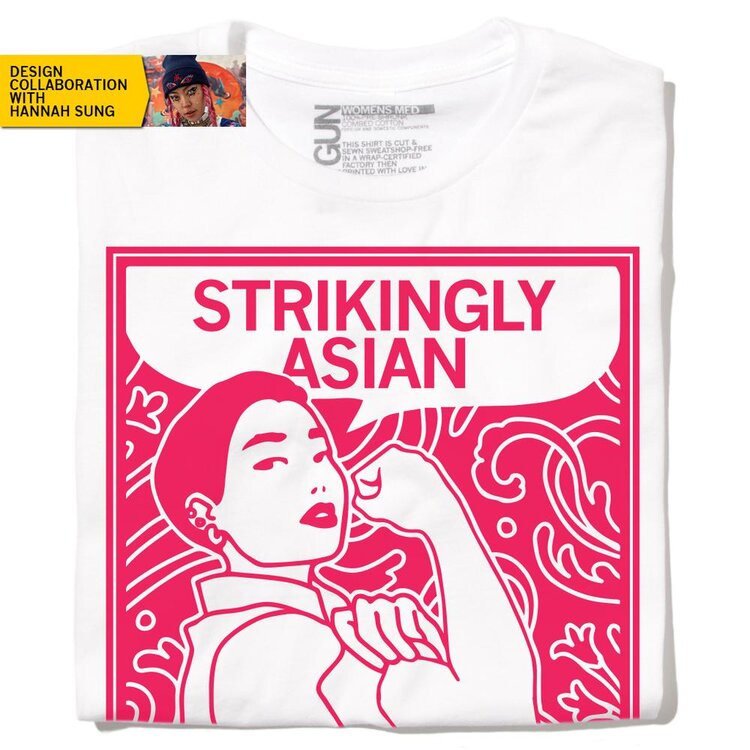 Strikingly Asian. Some Proceeds Go To AAPI Women Lead. Spicy Pink Screen Print on a White T-shirt (100% Combed and Ringspun Cotton). Cut and sewn sweatshop free. Designed by Hannah Sung and printed by Union Labor at RAYGUN.